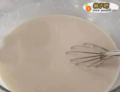 2碗中放入糯米粉白砂糖,倒入牛奶(或清水)搅拌成无颗粒的糊状