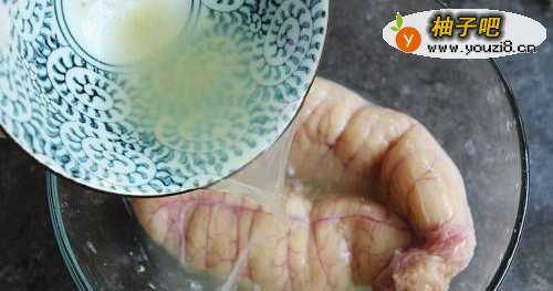 2把鱼籽清洗干净,撕去表面的一些细小的筋膜,然后倒入姜葱水浸泡10分钟;