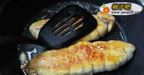 5把鱼籽放入锅内,煎鱼籽块的横切面,把里面大部分的水分都蒸发掉,煎好后的鱼籽块盛起备用;