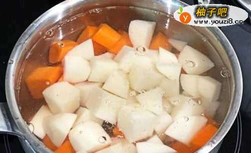 2准备一小锅水,放入红萝卜与马铃薯煮15分钟左右。
