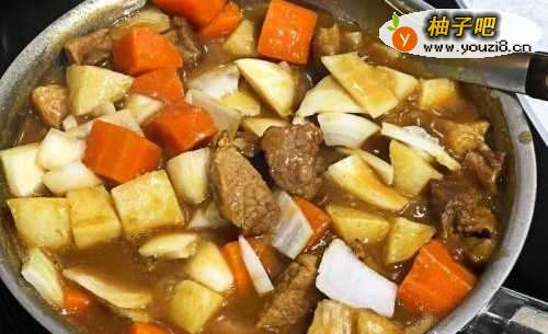 5加入水煮滚,转中小火或熄火,加入咖喱块煮拌到全部融化。加入煮软的红萝卜与马铃薯及生洋葱片,开中大火拌煮到咖喱变浓稠、洋葱软化。