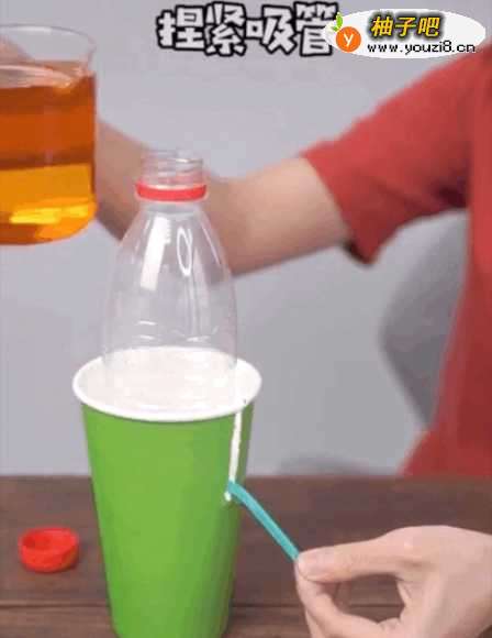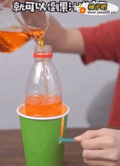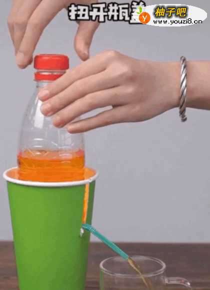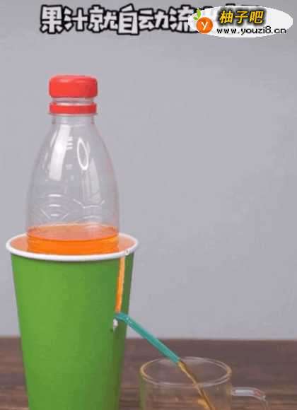 吸管(1)在瓶子下方戳一个洞,塞的进吸管就好; (2)在纸杯上开一条缝; (3)将瓶子放入纸杯; (4)捏住吸管将果汁倒入矿泉水瓶; (5)拧紧矿泉水瓶; (6)松开吸管,只有拧开瓶盖果汁才会出来哦。