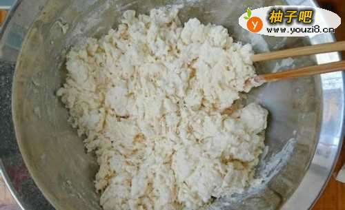 9下面我们来做裤带面。将面粉倒在面盆里,撒1料勺盐,缓缓注入温水,搅拌成絮状后,再揉成表面光滑的面团,盖上湿布静置10分钟。