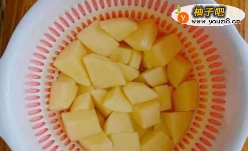 2土豆去皮切滚刀块,在流水下反复冲洗掉淀粉后,浸泡在水中,以防氧化变黑。红绿椒均洗净去籽斜刀切片。