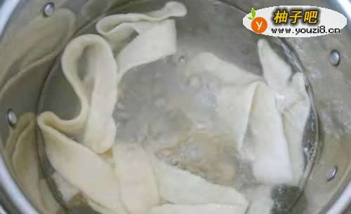 11锅中注水烧沸后,撒1料勺盐,把扯好的裤带面一根根放下去,水烧开后,倒一碗凉水,再继续煮至水开,面条浮在表面即可盛出装盘,然后把煮好的鸡肉放在上面,浇上汤汁即可。