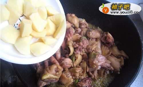 6炒至水份大部分消失,放入土豆,炒两分钟,倒入生抽,老抽,炒至土豆表面呈略透明的黄色。
