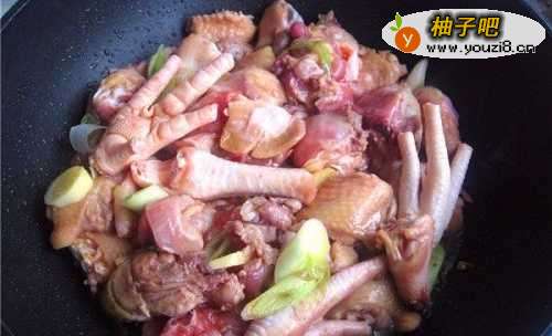 5热锅放油,油温6成热,下入腌制好的鸡块,翻炒,待变色放入葱姜,大料,继续翻炒。