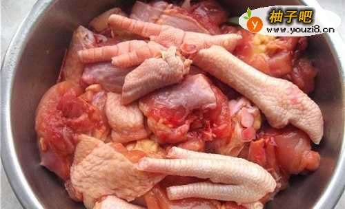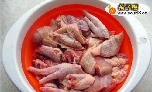 将鸡肉斩成大小适中的块儿,用清水冲洗干净,放入沥水盆中沥干水份,备用。
