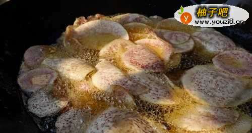 5再炸芋头等油温八成热把芋头放进去炸,待芋头的香味出来后基本上就熟了