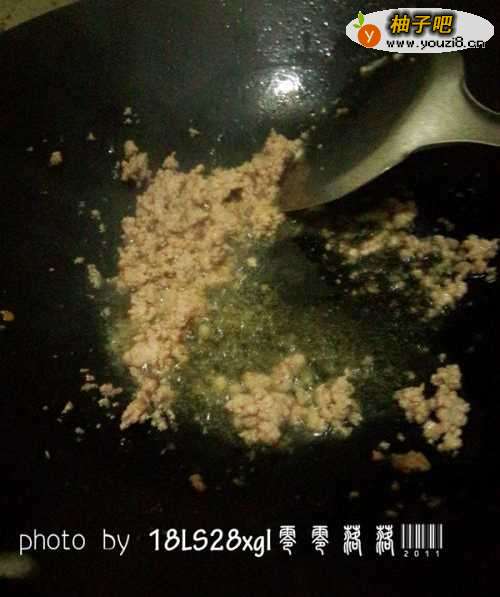 6热锅里倒入适量油烧热,将肉末放进锅里煸炒至颜色发白,调入料酒、生抽翻炒均匀后,起锅备用;