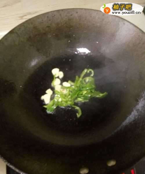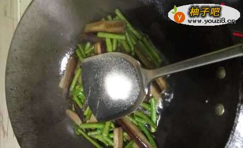 5爆炒辣椒丝和大蒜子,倒入炸好的豆角和茄子,翻炒片刻后,加入适量的水。