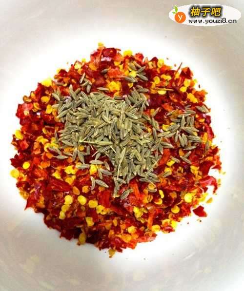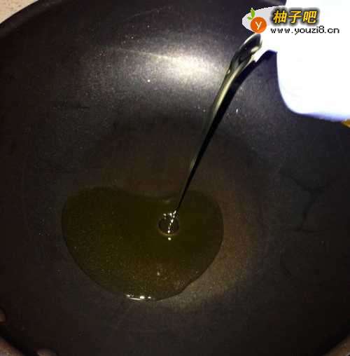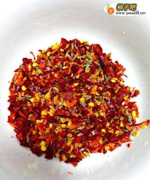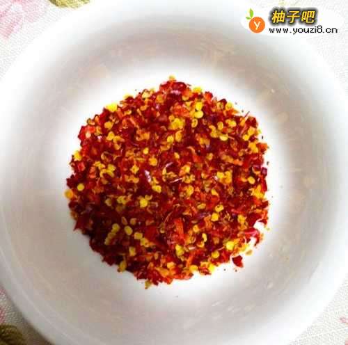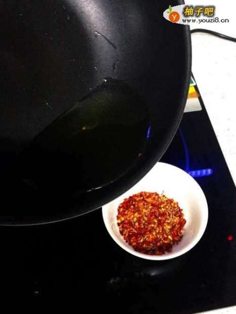 5把锅了倒入油,一定要控制好油温。油温过高辣椒该糊了。(可以放锅里一粒辣椒来试试油温。)