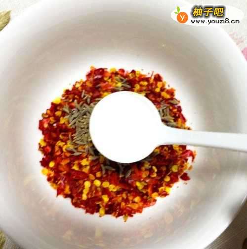 7这个时候最好用筷子搅拌让油和辣椒受热均匀。