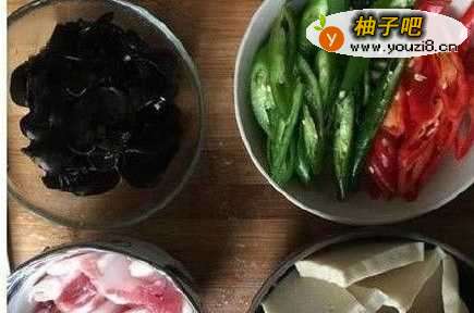 备料:千叶豆腐切片,黑木耳泡发好洗净撕成小片,洋葱切条,五花肉切薄片;青椒红椒斜切丝,生姜切丝备用;