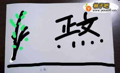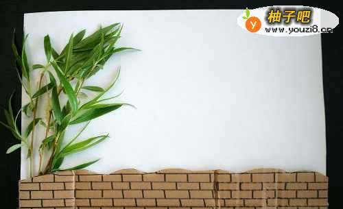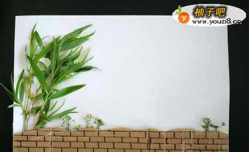 3拿出准备好的柳条,取合适的部分做一棵小树,将柳条的底部压在小路的下面,用胶带把柳条上面的部分粘在纸上,要粘的隐秘一些才好看。