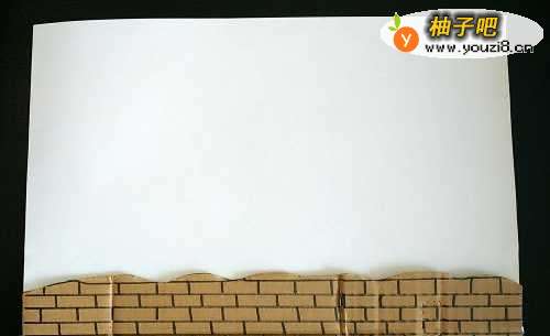 2为了让画面有立体感,我选用厚一点的纸盒做一条小路:将纸盒剪成一个长方形,然后用黑色彩笔画出砖块的样式,画好以后,把小路的上面边缘剪出一点弧度,看起来逼真一些,将它贴在刚刚规划好的地方。