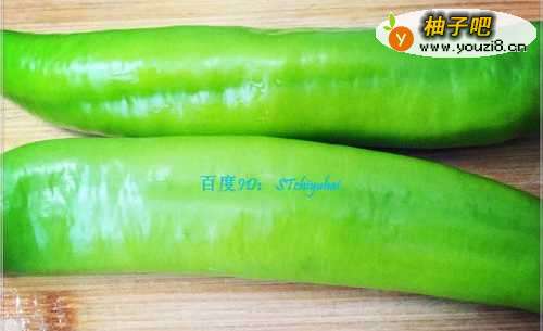 4准备2个黄皮椒,将其清洗一下,然后切去头尾,沿着斜线将黄皮椒切成小段状。