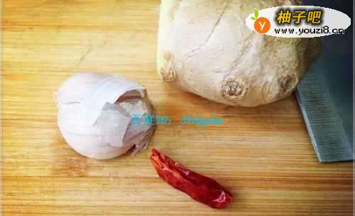 6准备少许蒜头、生姜、辣椒干,分别处理一下,将其加工成蒜末、姜丝、辣椒段,将刚才焯牛蛙的水倒掉,将锅清洗干净,然后沥干水渍,加入适量油,放入骨料爆香。
