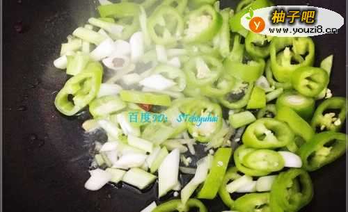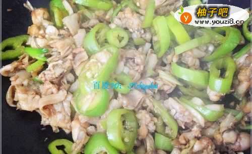 7先倒入黄皮椒和葱头,混合炒一会,待黄皮椒开始变软之后,再倒入前面腌制的牛蛙肉。