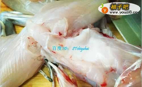 准备1~2只牛蛙,让卖牛蛙的师傅帮忙处理一下,皮不要;将牛蛙带回来清洗一下,然后切成小块状。