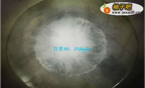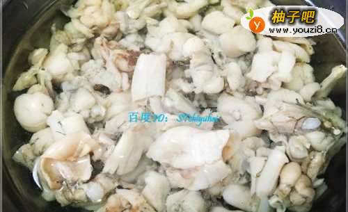 2打开电磁炉,往锅内加入适量的水,加入少许盐巴和醋将水烧开,倒入前面切好的牛蛙肉,过水焯一阵,5~7分钟左右。