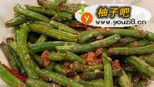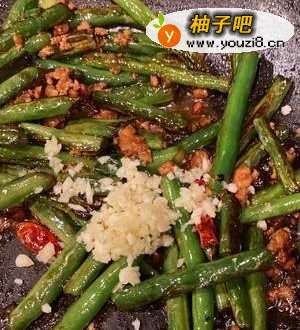 6倒入炒好的少许肉末,四季豆,再放少许蒜末凤塑耍快速翻炒。