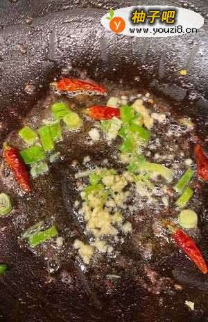 5少许油炒热后放干辣椒,葱姜蒜,炒出香味
