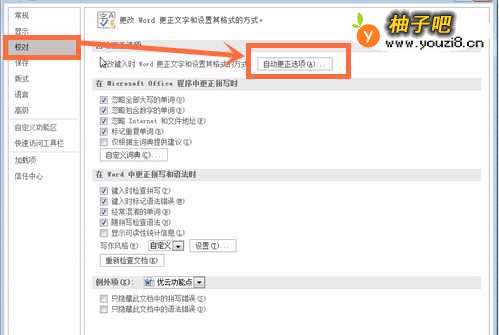5在【Word选项】弹出框中切换至【校对】页面,点击【自动更正选项】