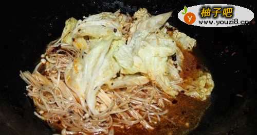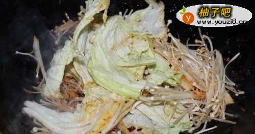 3放入金针菇和白菜翻炒。