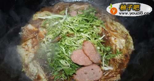 7放入苦苣和红肠烫一下。
