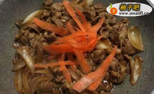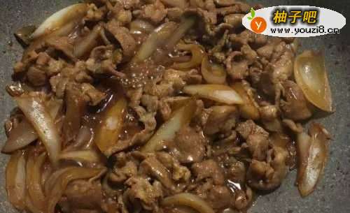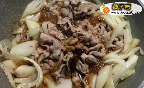 3放入猪五花肉片,将肉片炒至八分熟,然后加入2大匙的酱油和1大匙的酱油膏,拌匀