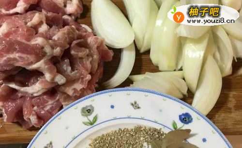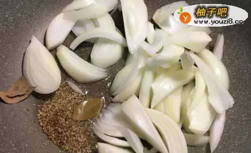 2锅热加油,放入洋葱、胡椒粒、月桂叶用中小火炒香,让所有食材均匀的裹上油