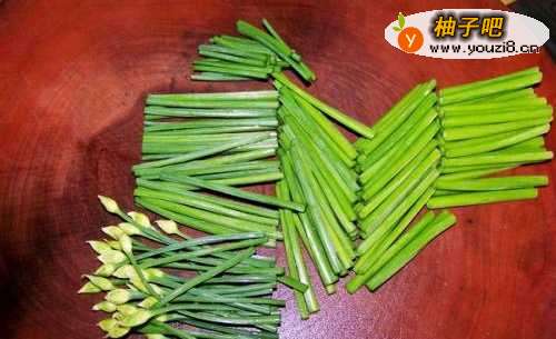 2韭菜花洗净,去老根,切5cm长段待用