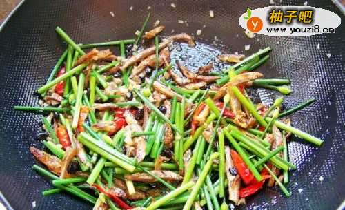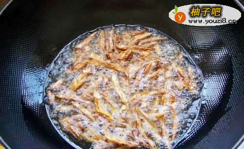 7下火焙鱼,撒味精、盐,翻炒1分钟