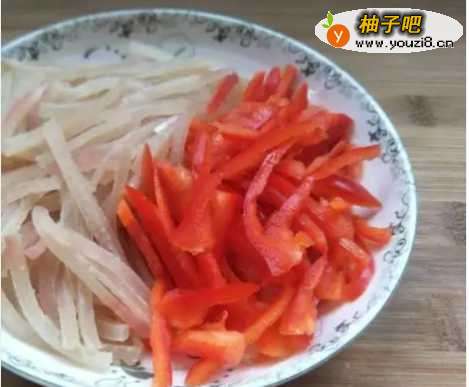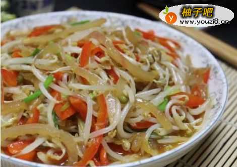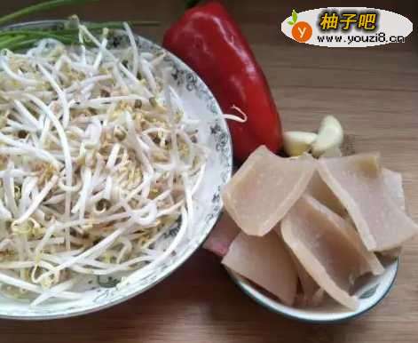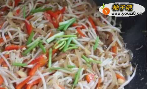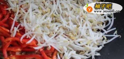 88、再把豆芽和红椒丝放进去大火翻炒。最后撒上葱叶段翻炒均匀就可以起锅了。