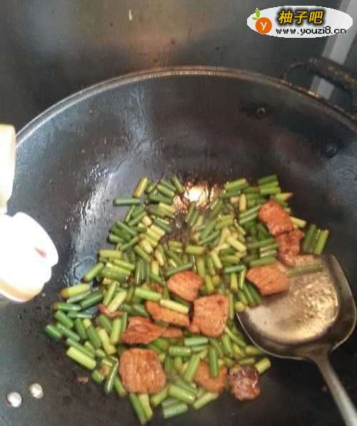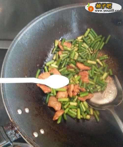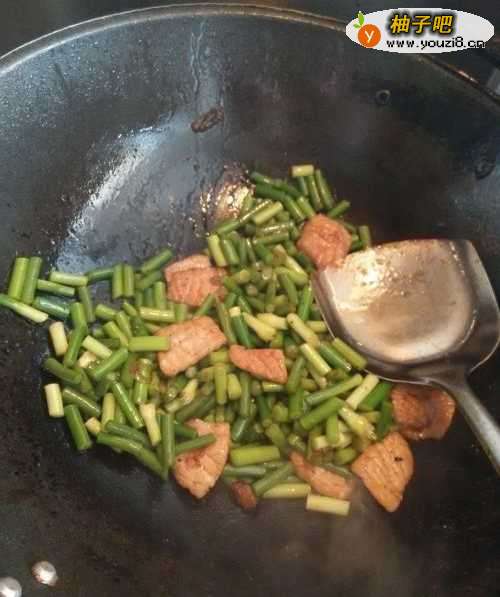 5将肉片炒香后,放入蒜薹一起炒。