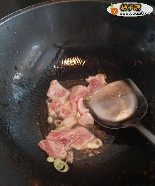 3等葱炝出香味后,将肉片放入锅中煸炒。