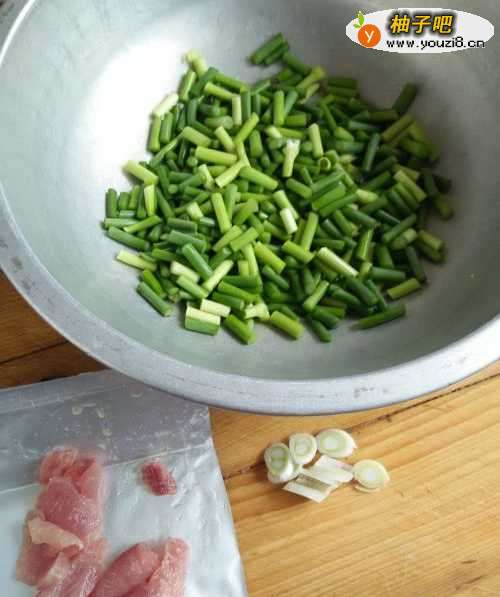 将蒜薹洗净,切成寸段,瘦肉切成片,葱切成丝。