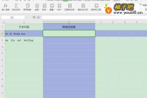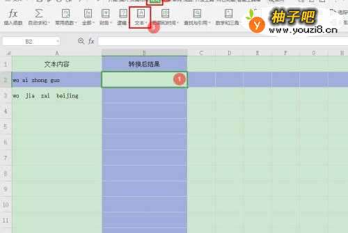 2选择单元格【B2】,点击【公式】—【文本】;