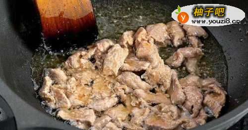 4另取炒锅烧热加入油(这时的油一定要多一些)烧至8 成热,下入腌制好的牛里脊,用筷子划散开肉片,至七成熟捞出待用。