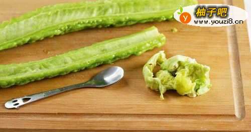 苦瓜用刀从中间剖开分成两半,用小勺去籽。将去籽凉瓜和胡萝卜切片。
