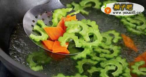 3锅中加水烧开,下入苦瓜片和胡萝卜片汆烫20 秒,捞出用凉水冲凉待用。