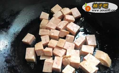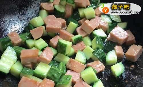 4然后先把切成丁的午餐肉倒进去稍微翻炒一下,带午餐肉热了就可以。