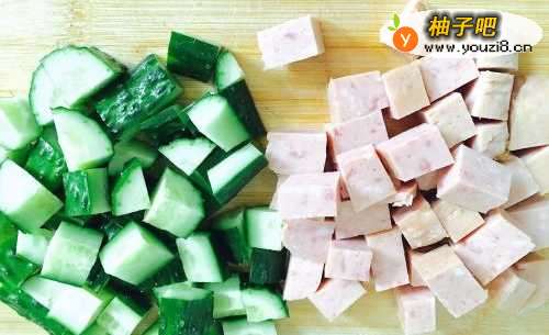 2洗干净的黄瓜去头去尾切成丁,午餐肉也切成丁备用。