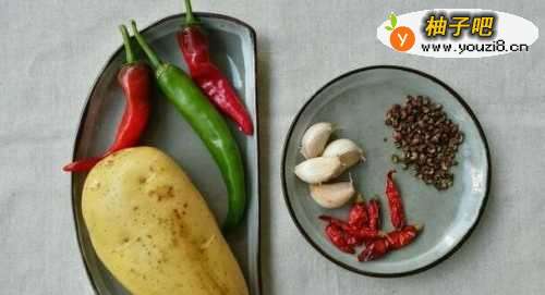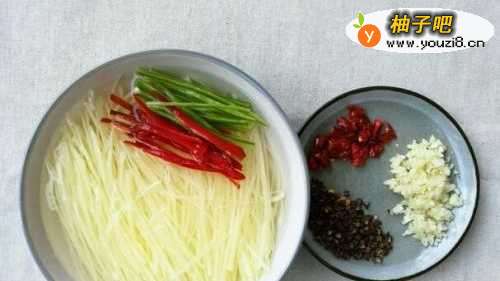 2三种食材全部切丝,大蒜切末,干辣椒剪段。土豆丝泡水里一定要多过几遍水,把白白的淀粉冲掉,炒起来才会干净爽脆。