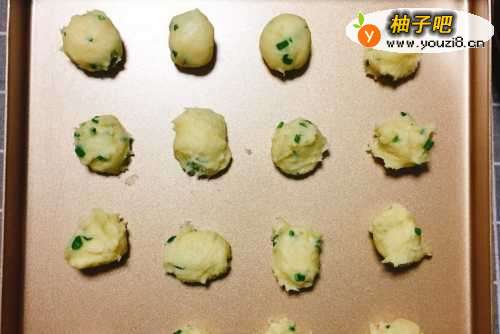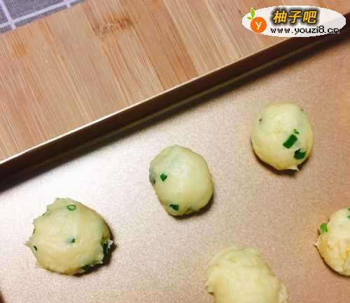 6带上一次性手套,将面团分成类似糯米糍大小并搓圆,放到烤盘上。