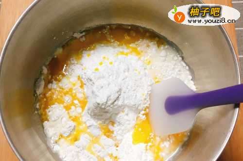 2黄油和白糖隔热水融化后,加入麻薯粉、牛奶和鸡蛋。