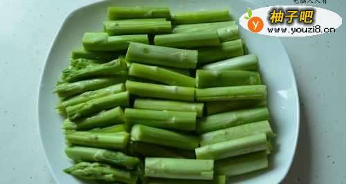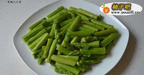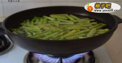 4开锅烧水,水开之后,将切好的芦笋、盐(底味)、油(保持食材不变色,有光泽)倒入锅中汆水。