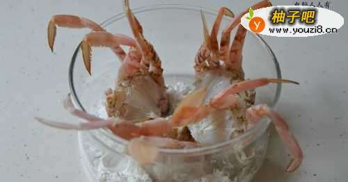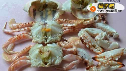 7处理花蟹:将花蟹洗净,蟹壳掰开,再将蟹一切二。