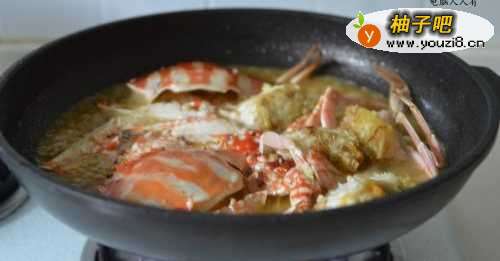 12加水烧煮(勿加盖,否则会影响花蟹的口感)。